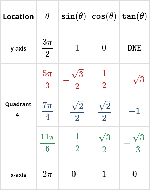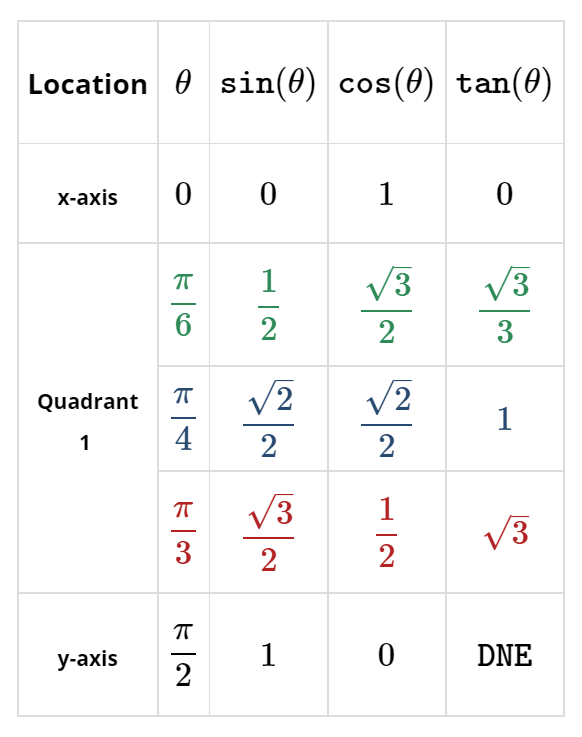 | Location | \(\theta\) | \(\texttt{sin}(\theta)\) | \(\texttt{cos}(\theta)\) | \(\texttt{tan}(\theta)\) |